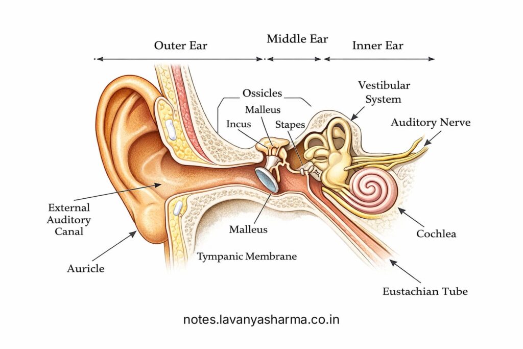 The human ear is an important sense organ, and we have two ears located on either side of our face. The part of the ear that we can see from outside is only a small portion of the entire ear structure. The ear, also known as the auditory system, is divided into three main parts: the outer (external) ear, the middle ear, and the inner ear. Each part has a specific role in the process of hearing. The inner ear is connected to the auditory nerve, which carries sound signals to the brain through the auditory nervous system.