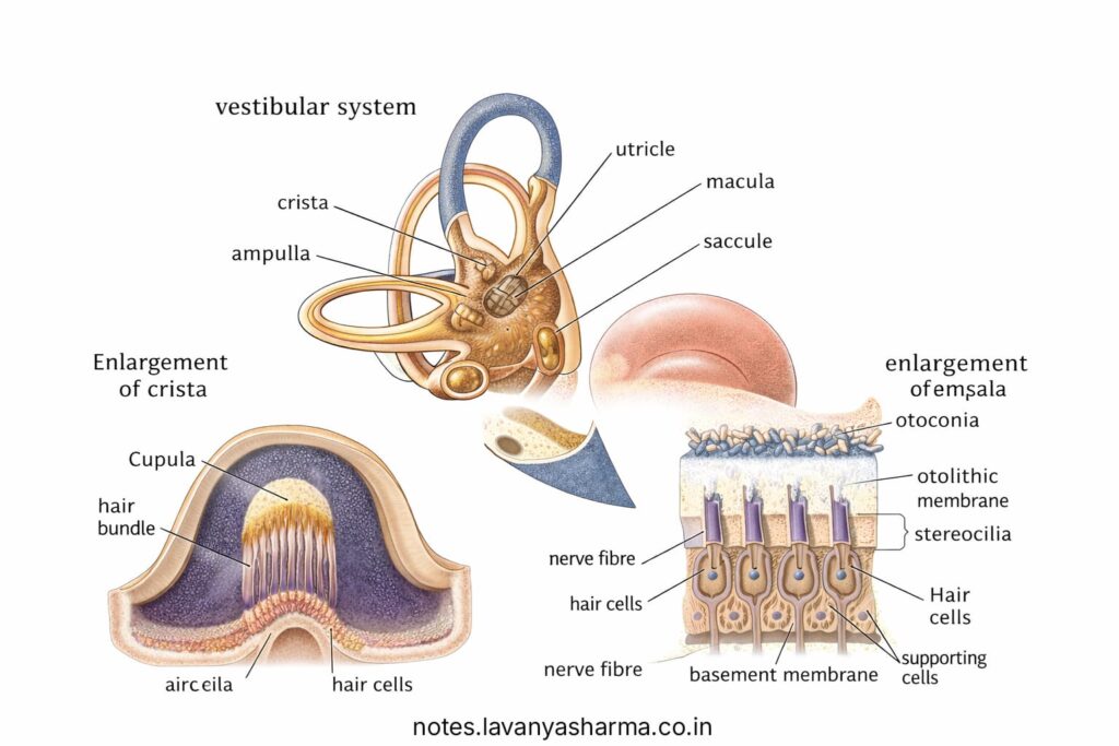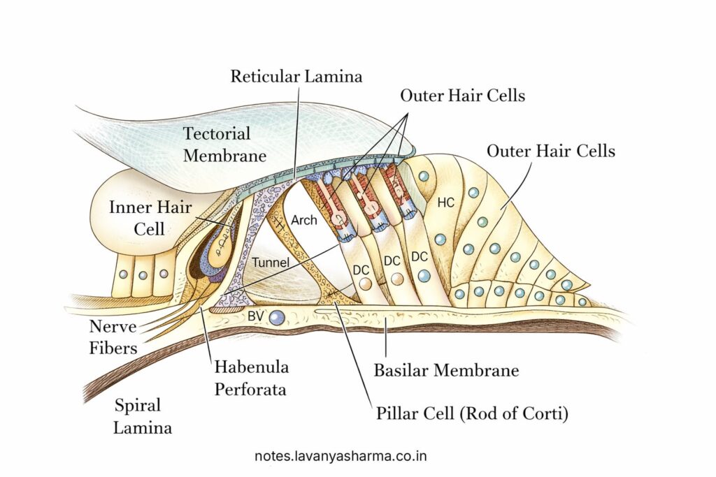 These hair cells are connected to the auditory nerve (8th cranial nerve), which carries sound signals to the brain. The signals pass through important centers such as the cochlear nucleus, superior olivary complex, and inferior colliculus. Finally, the sound is processed and understood in the auditory cortex, which is located in the temporal lobe of the brain.